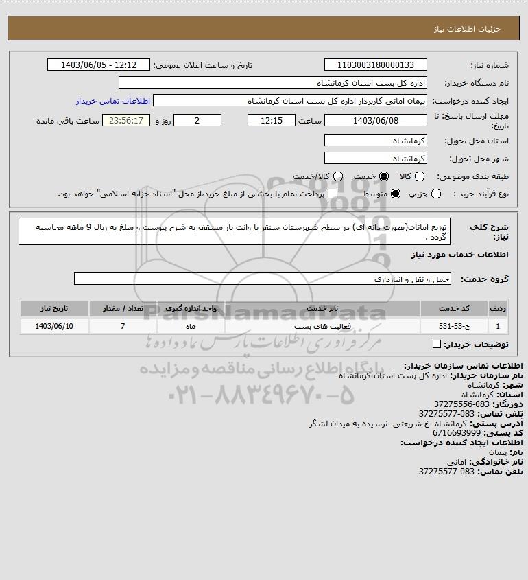 شرح کلی نیاز: توزیع امانات(بصورت دانه ای) در سطح شهرستان سنقر با وانت بار مسقف به شرح پیوست و مبلغ به ریال 9 ماهه محاسبه گردد .