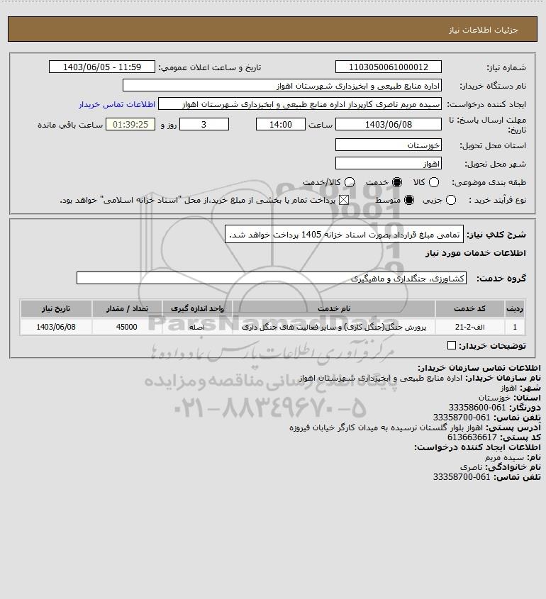 شرح کلی نیاز: تمامی مبلغ قرارداد بصورت اسناد خزانه 1405 پرداخت خواهد شد.