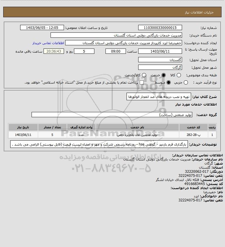 شرح کلی نیاز: تهیه و نصب دریچه های ضد انفجار الواتورها