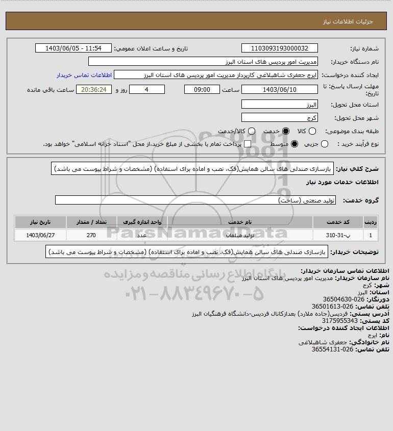 شرح کلی نیاز: بازسازی صندلی های سالن همایش(فک، نصب و اماده برای استفاده) (مشخصات و شراط پیوست می باشد)