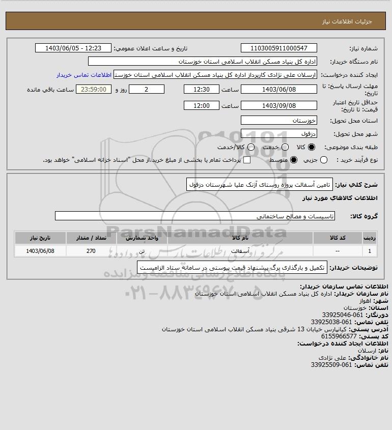 شرح کلی نیاز: تامین آسفالت پروژه روستای آژنک علیا شهرستان دزفول