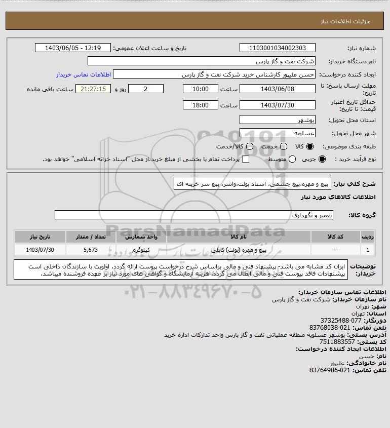 شرح کلی نیاز: پیچ و مهره،پیچ چشمی، استاد بولت،واشر، پیچ سر خزینه ای