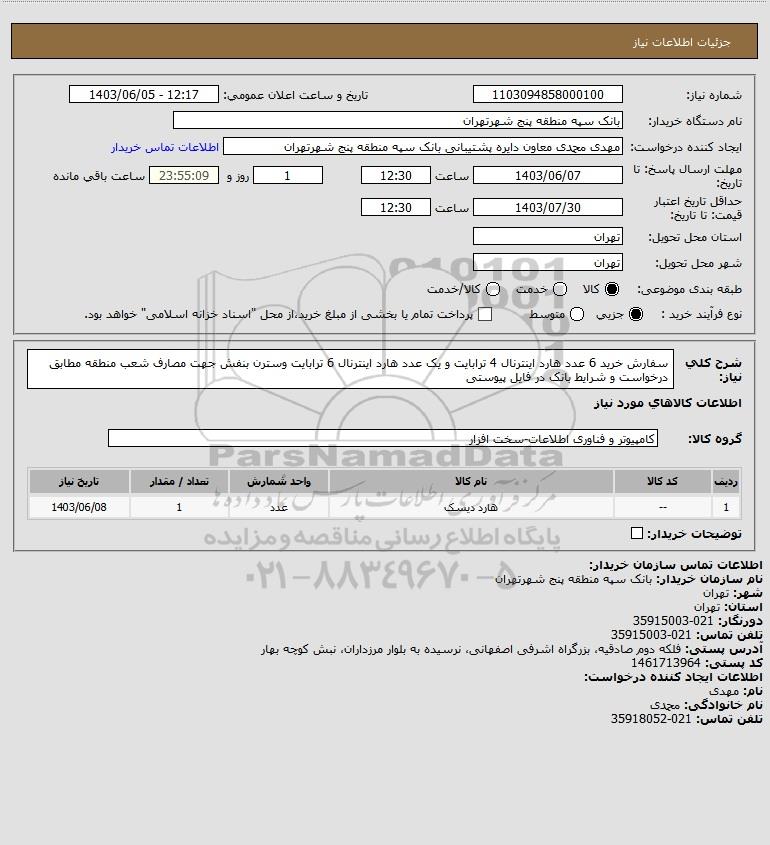 شرح کلی نیاز: سفارش خرید 6 عدد هارد اینترنال 4 ترابایت و یک عدد هارد اینترنال 6 ترابایت وسترن بنفش جهت مصارف شعب منطقه مطابق درخواست و شرایط بانک در فایل پیوستی