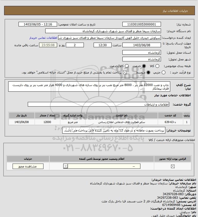 شرح کلی نیاز: چاپ و نصب 12000 متر بنر ، 8000 متر مربع نصب بنر بر روی سازه های شهرداری و 4000 هزار متر نصب بنر بر روی داربست فلزی پیمانکار