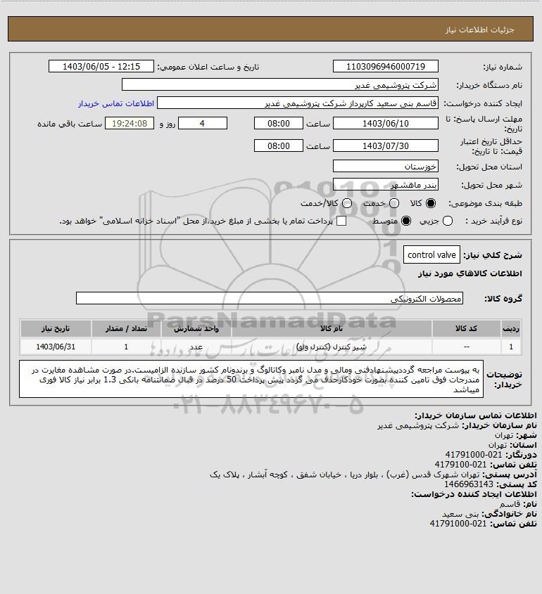 | 1 | -- | شیر کنترل (کنترل ولو) | عدد | 1 | 1403/06/31 |