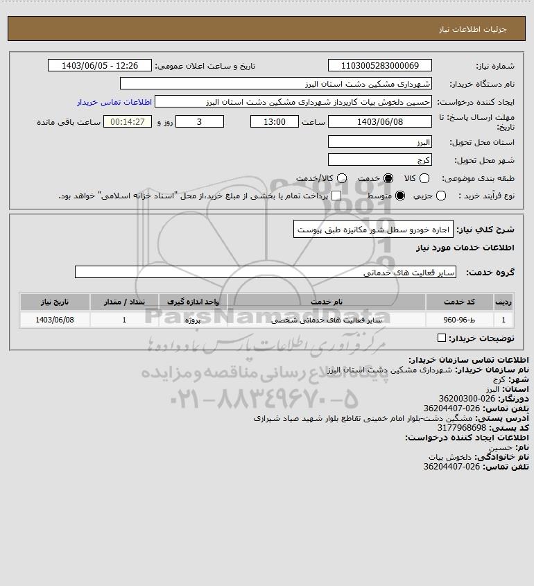 شرح کلی نیاز: اجاره خودرو سطل شور مکانیزه طبق پیوست