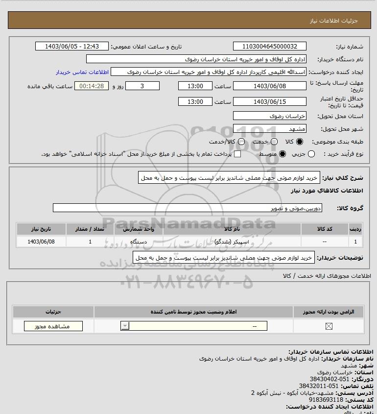 شرح کلی نیاز: خرید لوازم صوتی جهت مصلی شاندیز برابر لیست پیوست و حمل به محل