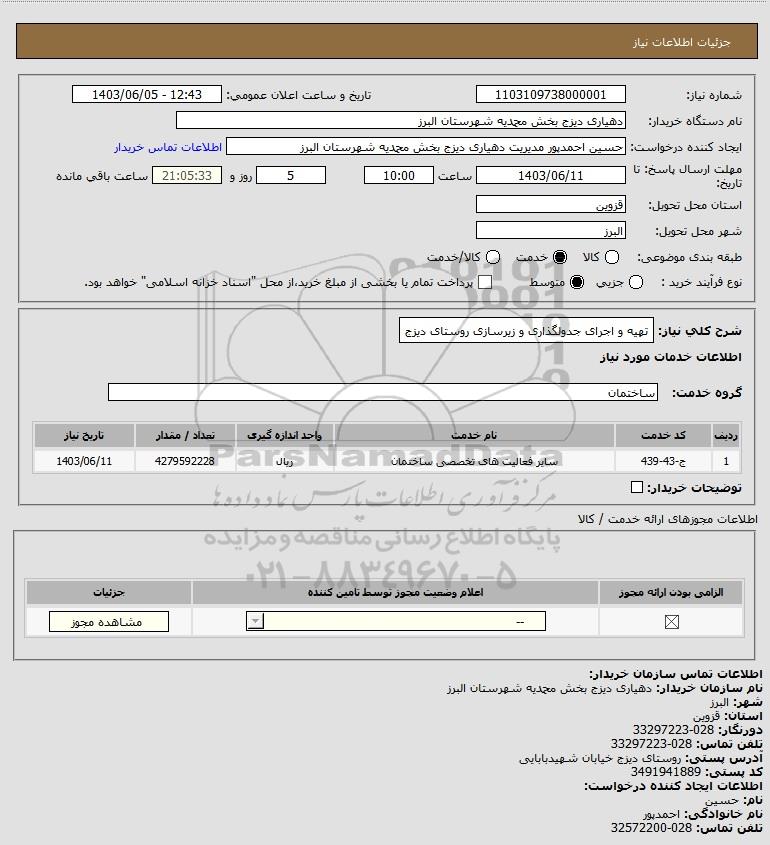 شرح کلی نیاز: تهیه و اجرای جدولگذاری و زیرسازی روستای دیزج