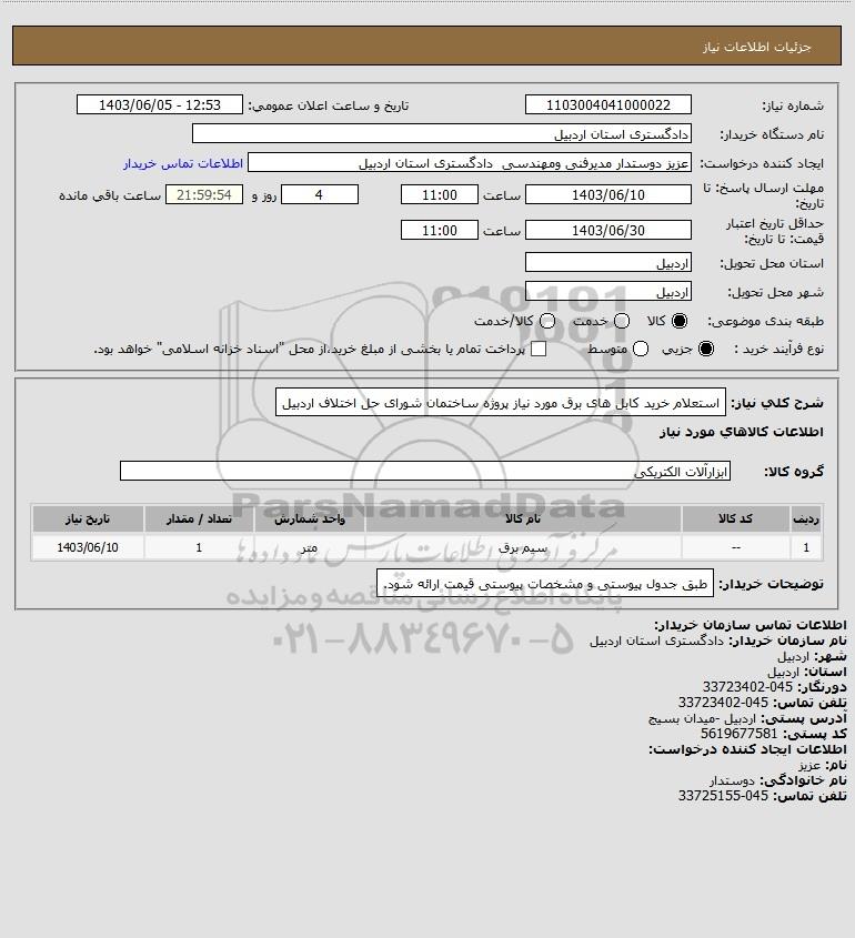 شرح کلی نیاز: استعلام خرید کابل های برق مورد نیاز پروژه ساختمان شورای حل اختلاف اردبیل