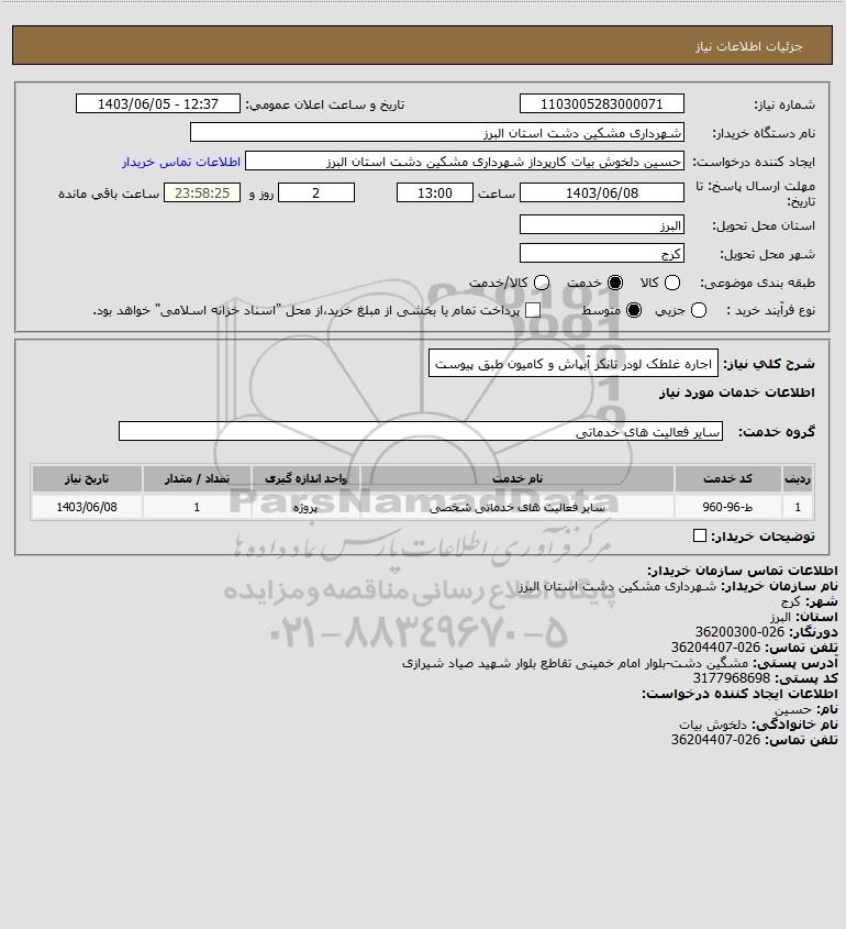 شرح کلی نیاز: اجاره غلطک لودر تانکر آبپاش و کامیون طبق پیوست