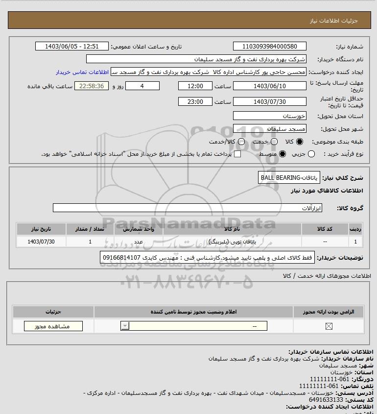 | 1 | -- | یاتاقان توپی (بلبرینگ) | عدد | 1 | 1403/07/30 |