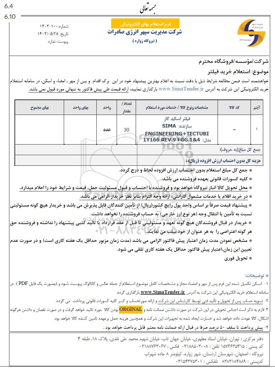| 1 | - | فیلتر اسکید گاز سازنده : SIMA ENGINEERING +TECTUBI مدل : 1Y166 REV.9 FGG.1&4 |