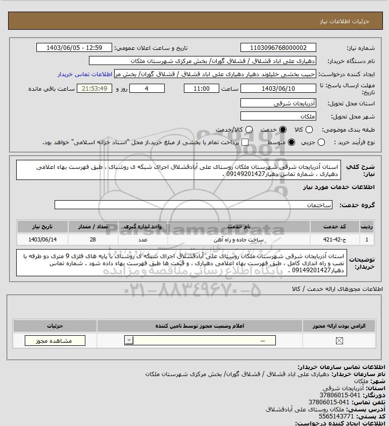 شرح کلی نیاز: استان آذربایجان شرقی شهرستان ملکان روستای علی آبادقشلاق اجرای شبکه ی روشنای ، طبق فهرست بهاء اعلامی دهیاری ، شماره تماس دهیار09149201427 .