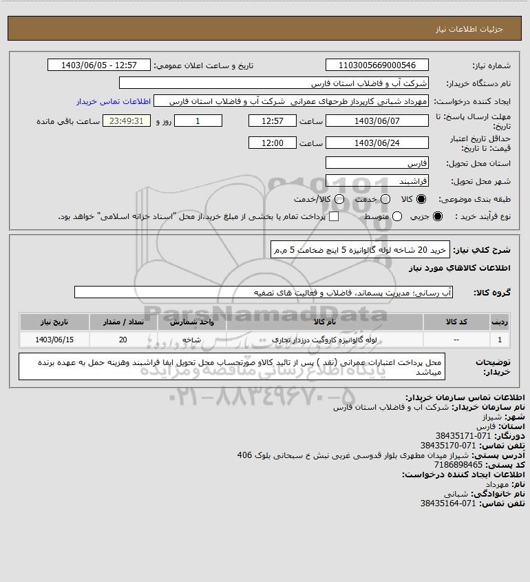 شرح کلی نیاز: خرید 20 شاخه لوله گالوانیزه 5 اینچ ضخامت 5 م.م