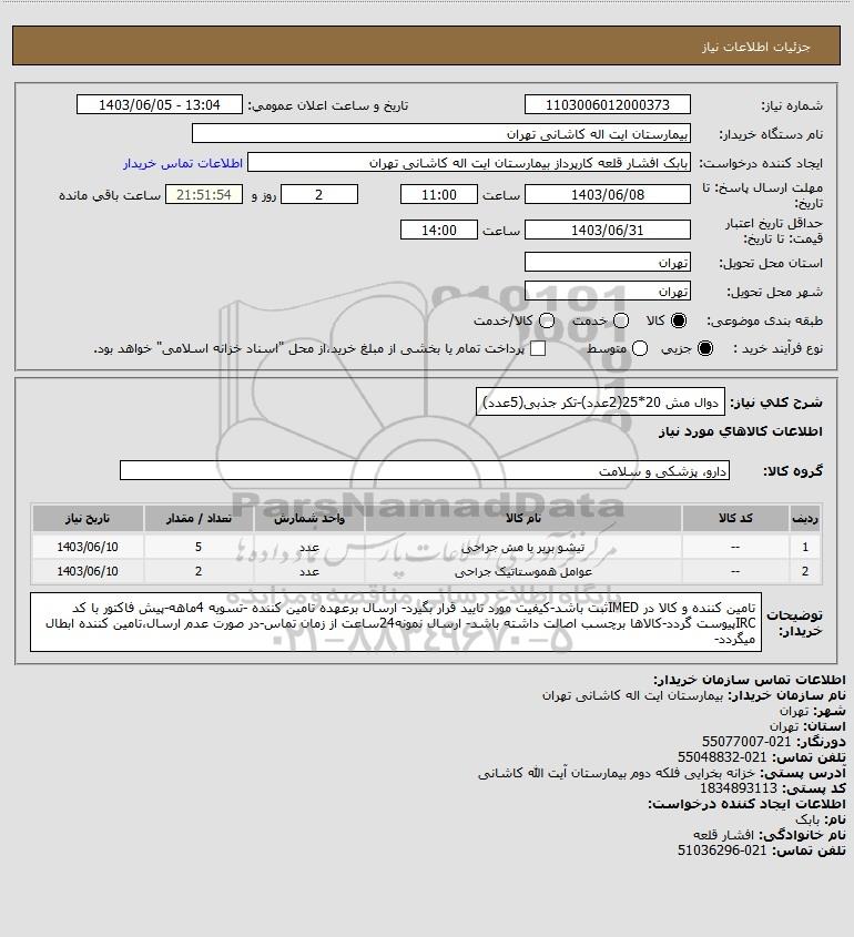 | 1 | -- | تیشو بریر یا مش جراحی | عدد | 5 | 1403/06/10 |
