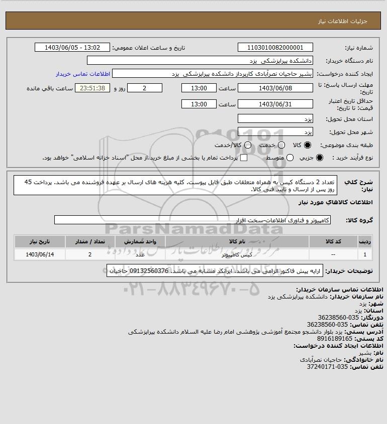 شرح کلی نیاز: تعداد 2 دستگاه کیس به همراه متعلقات طبق فایل پیوست. کلیه هزینه های ارسال بر عهده فروشنده می باشد. پرداخت 45 روز پس از ارسال و تایید فنی کالا.