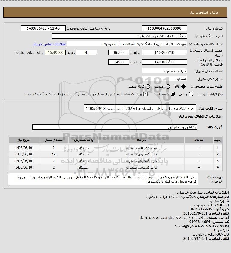 شرح کلی نیاز: خرید اقلام مخابراتی از طریق اسناد خزانه 202 با سر رسید 1405/09/23