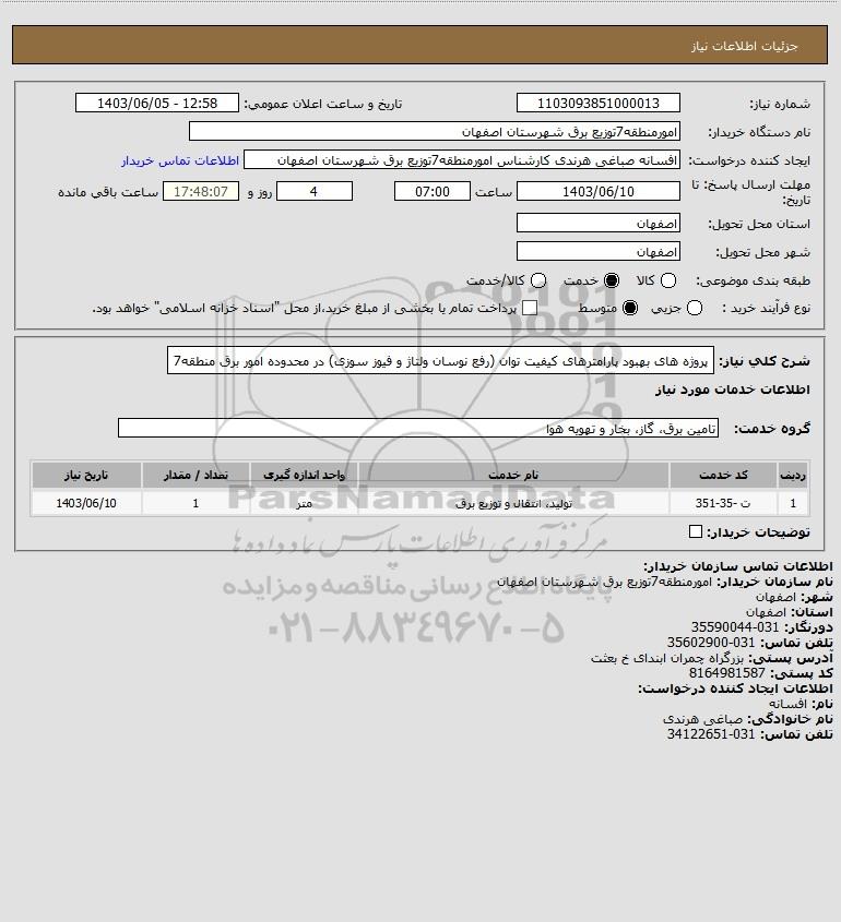 شرح کلی نیاز: پروژه های بهبود پارامترهای کیفیت توان (رفع نوسان ولتاژ و فیوز سوزی) در محدوده امور برق منطقه7