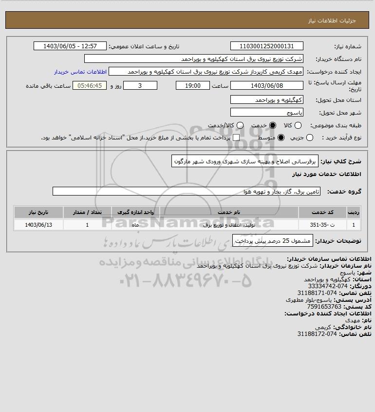 شرح کلی نیاز: برقرسانی اصلاح و بهینه سازی شهری ورودی شهر مارگون