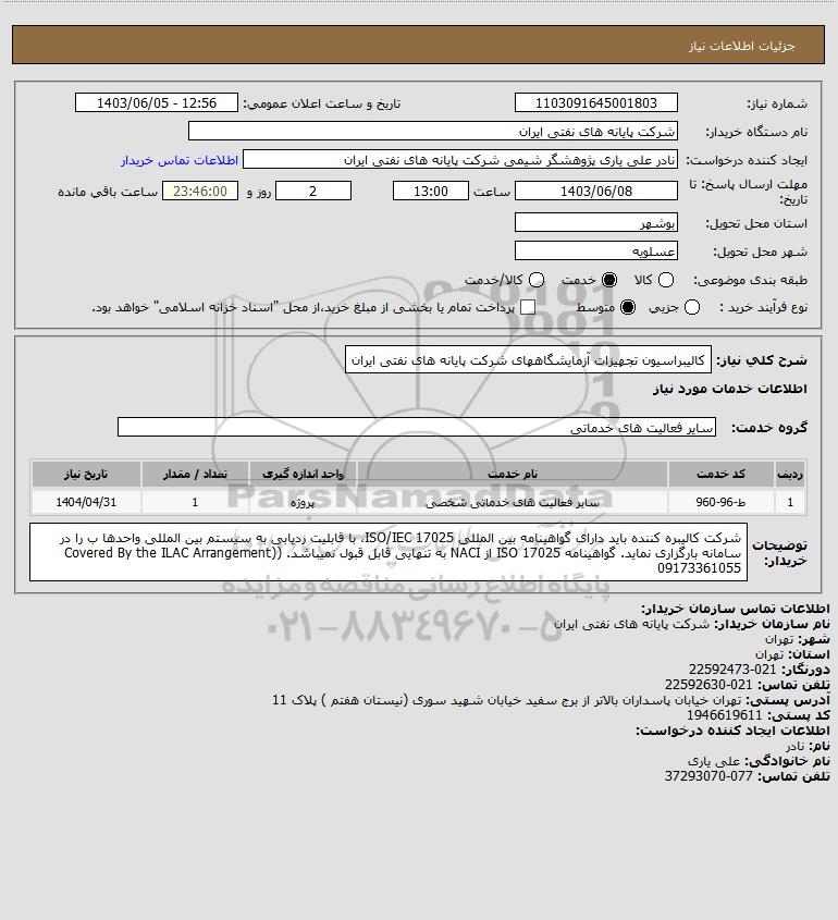 شرح کلی نیاز: کالیبراسیون تجهیزات آزمایشگاههای شرکت پایانه های نفتی ایران