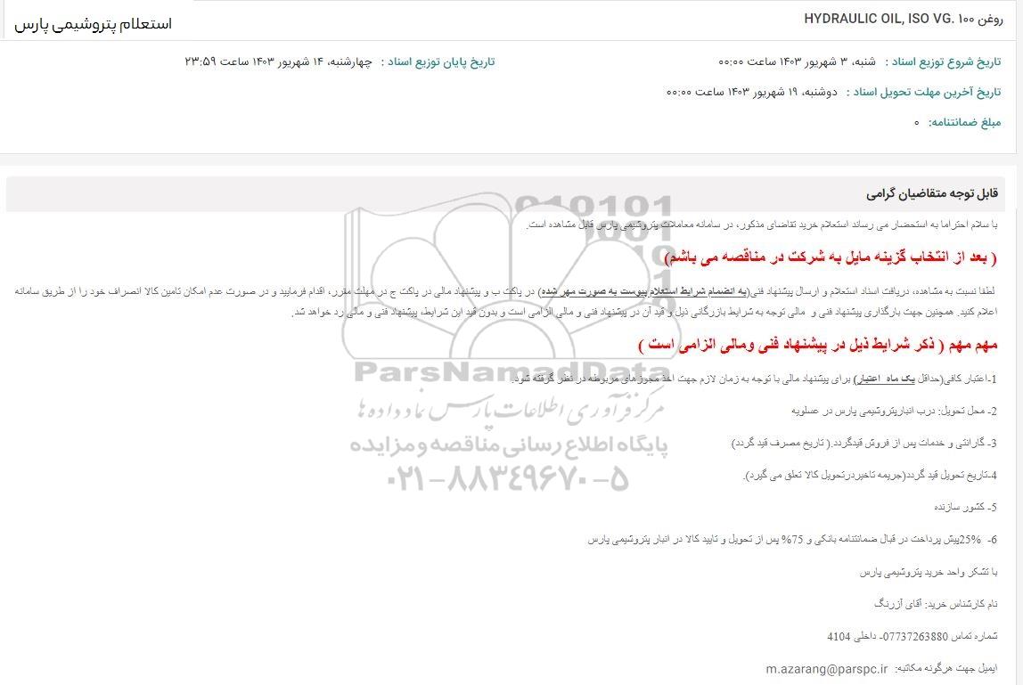 با سلام احتراما به استحضار میرساند استعلام خرید تقاضای مذکور در سامانه معاملات پتروشیمی پارس قابل مشاهده است.