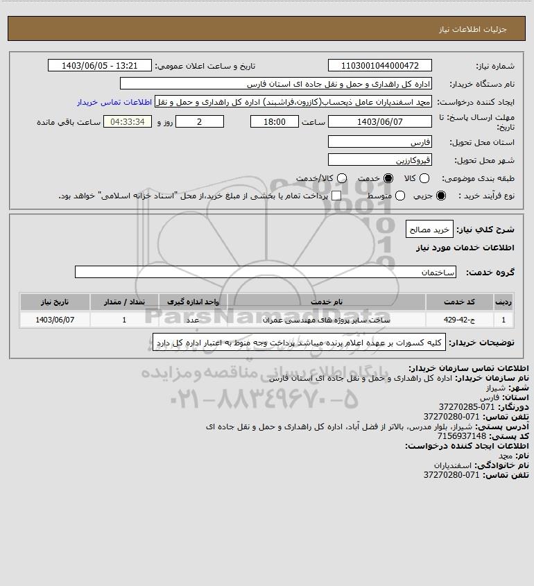 نام دستگاه خریدار:اداره کل راهداری و حمل و نقل جاده ای استان فارس