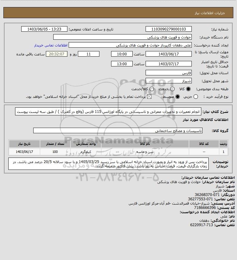 شرح کلی نیاز: انجام تعمیرات و تجهیزات عمرانی و تاسیساتی در پایگاه اورژانس 115 فارس (واقع در کفترک ) / طبق سه لیست پیوست