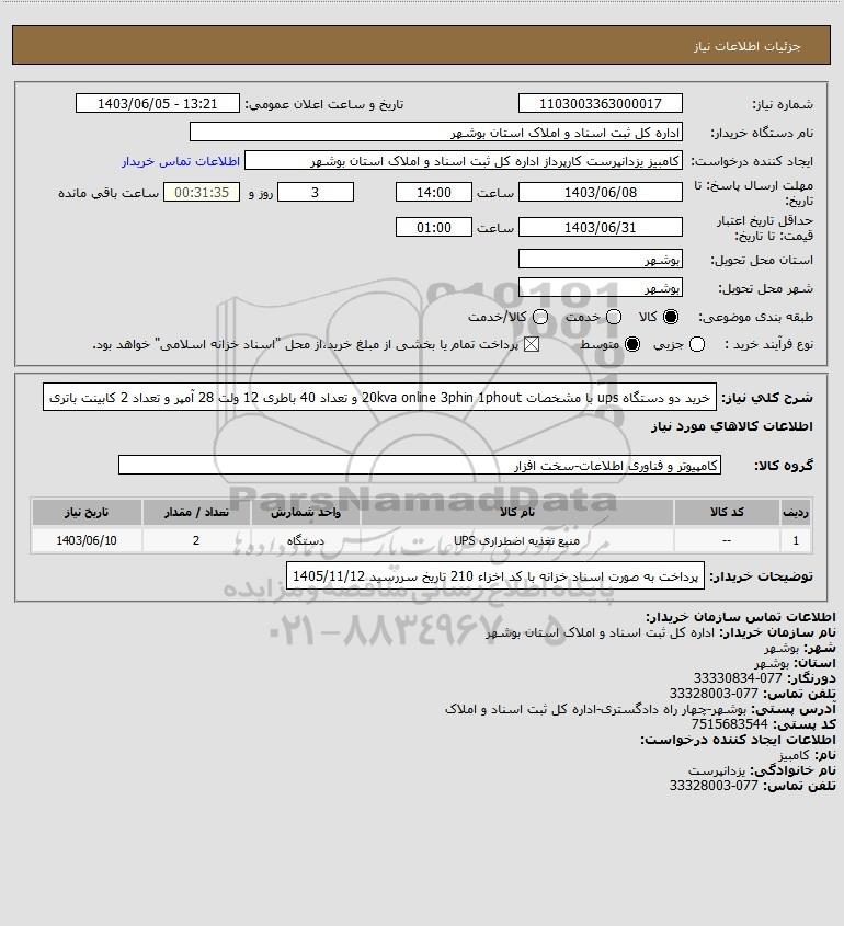 شرح کلی نیاز: خرید دو دستگاه ups با مشخصات 20kva online 3phin 1phout و تعداد 40 باطری 12 ولت 28 آمپر و تعداد 2 کابینت باتری
