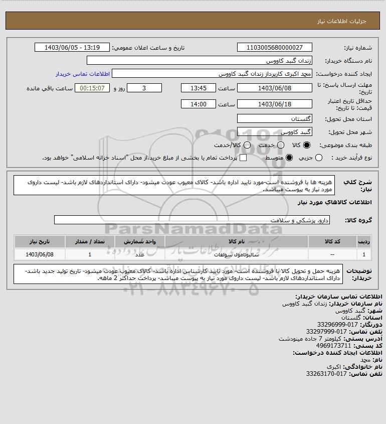 شرح کلی نیاز: هزینه ها با فروشنده است-مورد تایید اداره باشد- کالای معیوب عودت میشود- دارای استانداردهای لازم باشد- لیست داروی مورد نیاز به پیوست میباشد.
