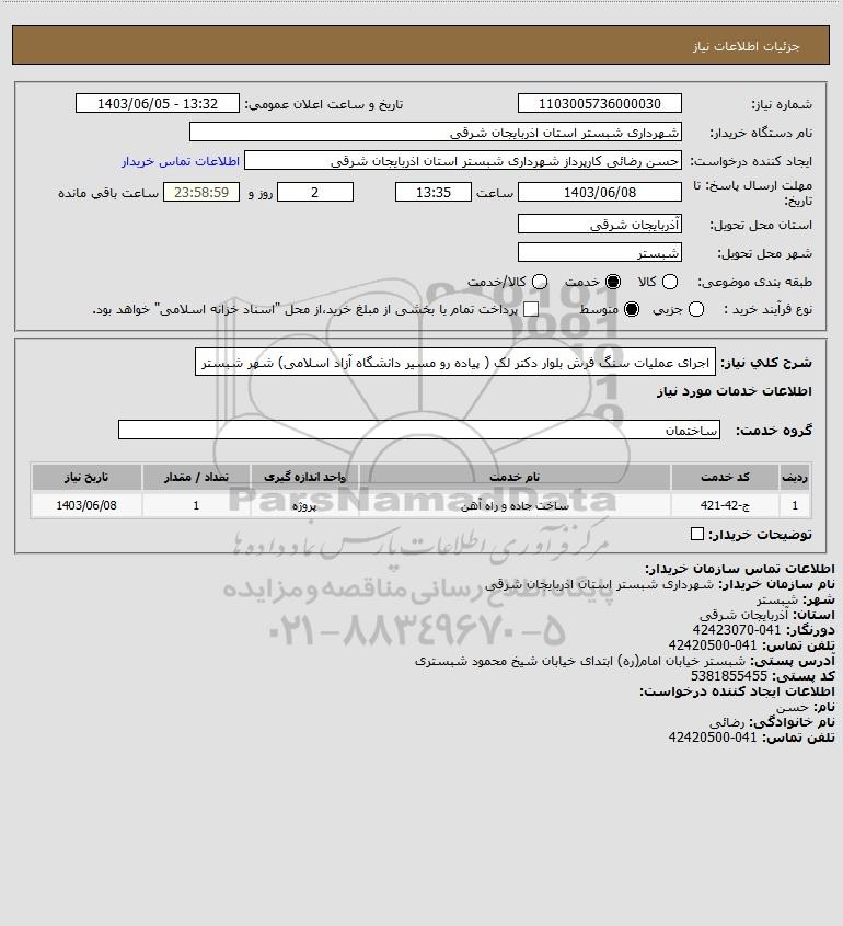 شرح کلی نیاز: اجرای عملیات سنگ فرش بلوار دکتر لک ( پیاده رو مسیر دانشگاه آزاد اسلامی) شهر شبستر