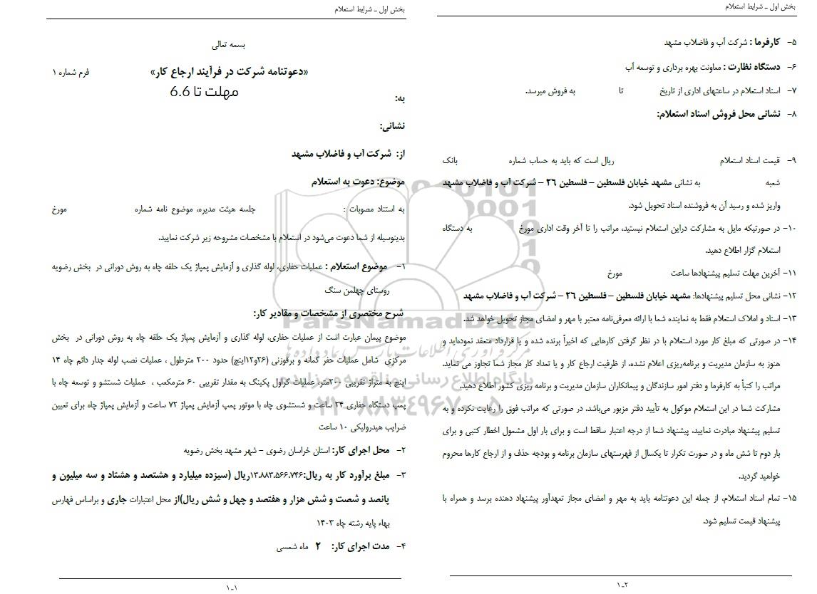 موضوع استعلام : عملیات حفاری لوله گذاری و آزمایش پمپاژ یک حلقه چاه به روش دورانی در بخش رضویه روستای چهلمن سنگ