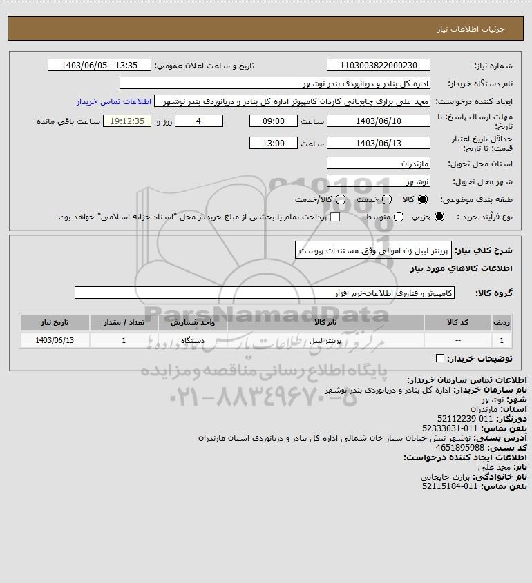 شرح کلی نیاز: پرینتر لیبل زن اموالی وفق مستندات پیوست