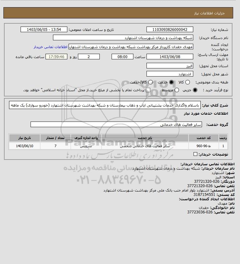 شرح کلی نیاز: باسلام واگذاری خدمات پشتیبانی ایاب و ذهاب بیمارستان و شبکه بهداشت شهرستان اشتهارد (خودرو سواری) یک ماهه