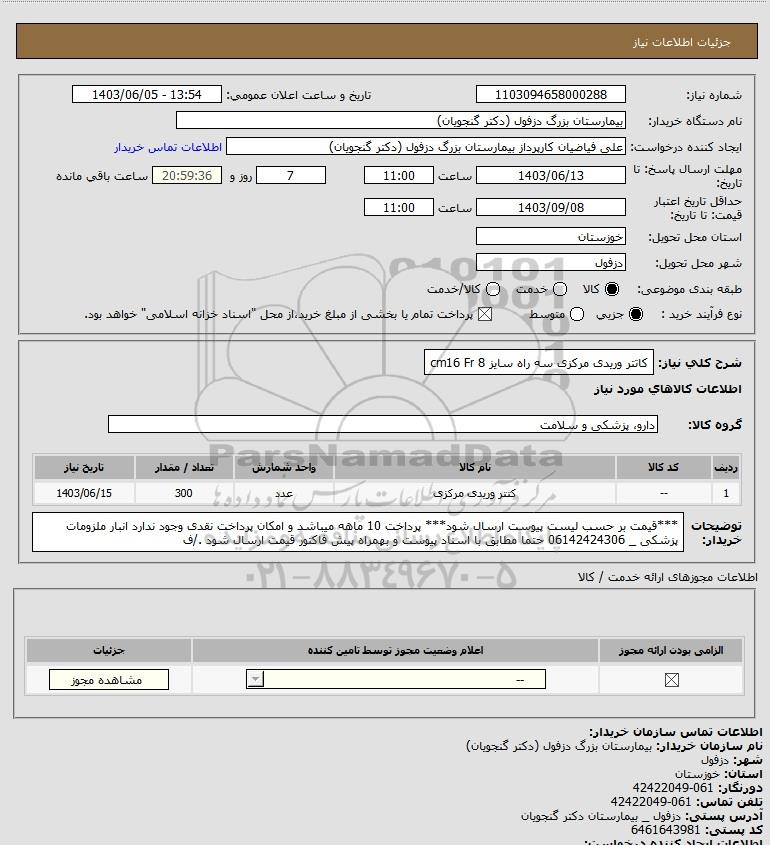 شرح کلی نیاز: کاتتر وریدی مرکزی سه راه سایز cm16 Fr 8