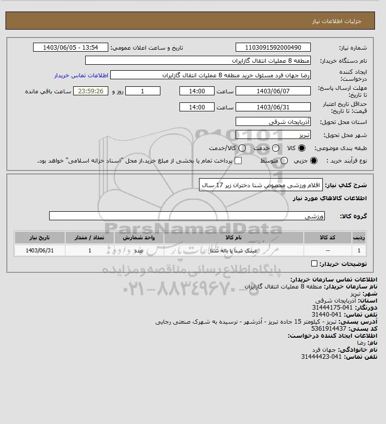 | 1 | -- | عینک شنا یا باله شنا | عدد | 1 | 1403/06/31 |