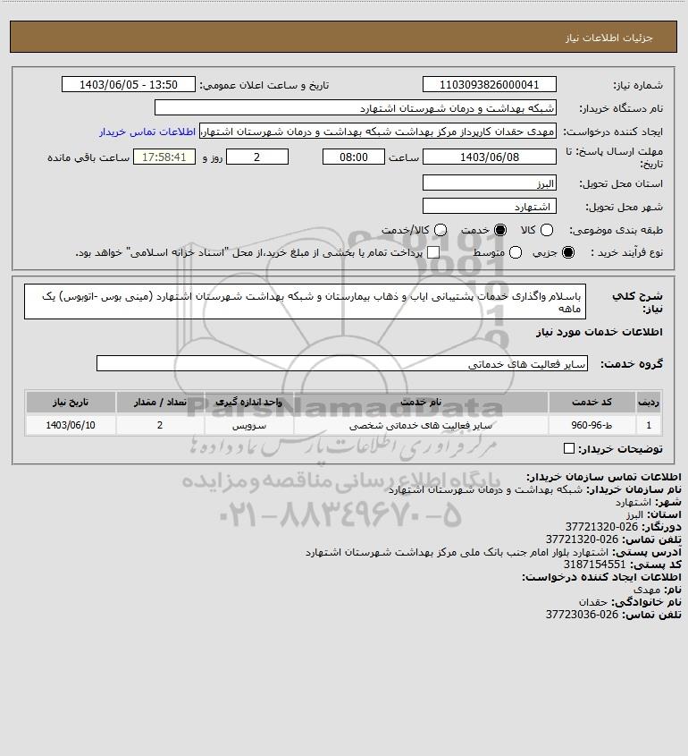 استعلام باسلام واگذاری خدمات پشتیبانی ایاب و ذهاب بیمارستان و شبکه بهداشت شهرستان اشتهارد (مینی بوس -اتوبوس) یک ماهه, استعلام باسلام واگذاری خدمات پشتیبانی ایاب و ذهاب بیمارستان و شبکه بهداشت شهرستان اشتهارد (مینی بوس -اتوبوس) یک ماهه