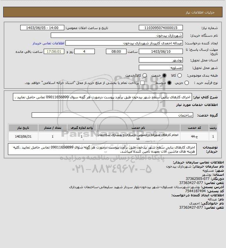 شرح کلی نیاز: اجرای کارهای بنایی سطح شهر بیدخون طبق برآورد پیوست درصورت هر گونه سوال 09011656899 تماس حاصل نمایید .