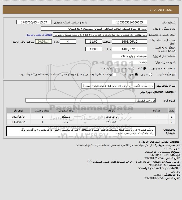 شرح کلی نیاز: خرید یکدستگاه دیزل ژنراتور 170کاوا (به همراه تابلو ترانسفر)