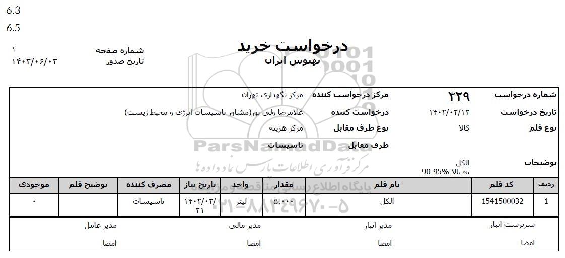 | 1 | 1541500032 | الکل | 5000 | لیتر | 1403.3.31 | تاسیسات |