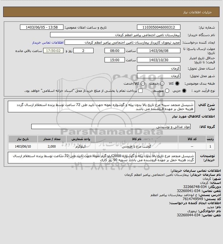 | 1 | -- | گوشت مرغ با افزودنی | کیلوگرم | 2,000 | 1403/06/10 |