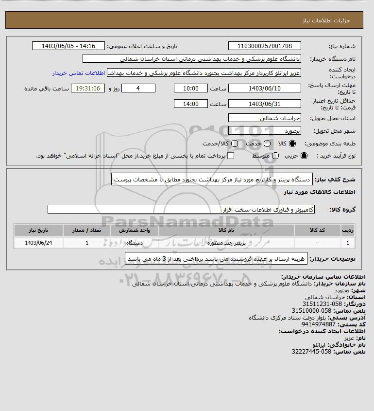 شرح کلی نیاز: دستگاه پرینتر و کارتریچ مورد نیاز مرکز بهداشت بجنورد مطابق با مشخصات پیوست