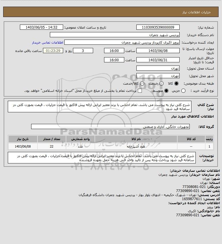 شرح کلی نیاز: شرح کلی نیاز به پیوست می باشد. تمام اجناس با برند معتبر ایرانی ارائه پیش فاکتور با قیمت جزئیات . قیمت بصورت کلی در سامانه قید شود