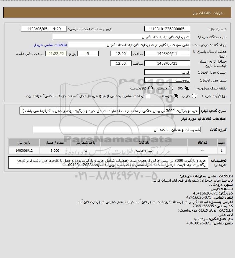 شرح کلی نیاز: خرید و بارگیری 3000 تن بیس خاکی از معدن زندی (عملیات شامل خرید و بارگیری بوده و حمل با کارفرما می باشد).