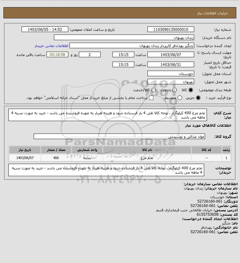 شرح کلی نیاز: تخم مرغ 400 کیلوگرم ، توجه کالا طی 4 بار فرستاده شود و هزینه هربار به عهده فروشنده می باشد - خرید به صورت نسیه 4 ماهه می باشد