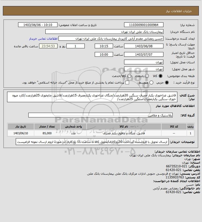 شرح کلی نیاز: قاشق غذاخوری یکبار مصرف سنگین 20هزارعدد/چنگال غذاخوری یکبارمصرف 15هزارعدد/قاشق چایخوری 25هزارعدد/کارد میوه خوری سنگین یکبارمصرف سنگین 25هزارعدد/