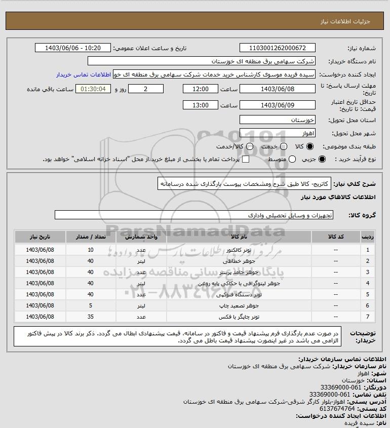 استعلام کاتریج- کالا طبق شرح ومشخصات پیوست بارگذاری شده درسامانه, استعلام کاتریج- کالا طبق شرح ومشخصات پیوست بارگذاری شده درسامانه
