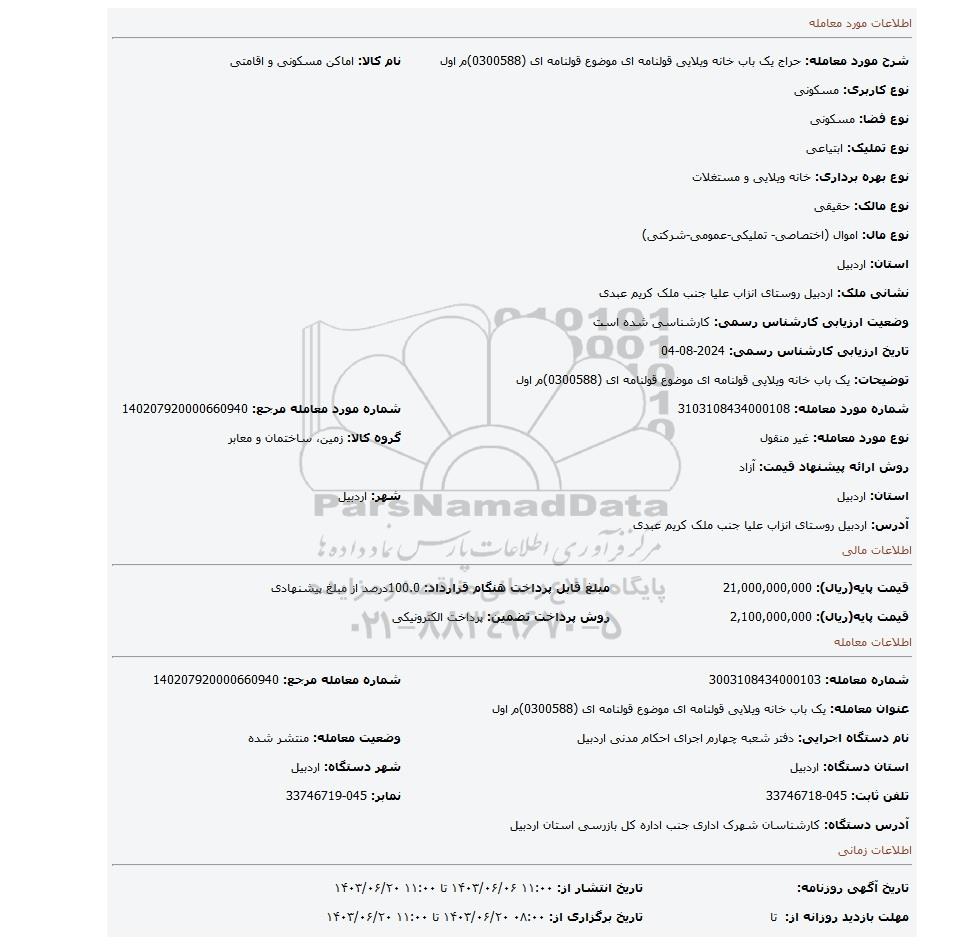 قیمت پایه(ریال): 2,100,000,000روش پرداخت تضمین: پرداخت الکترونیکی