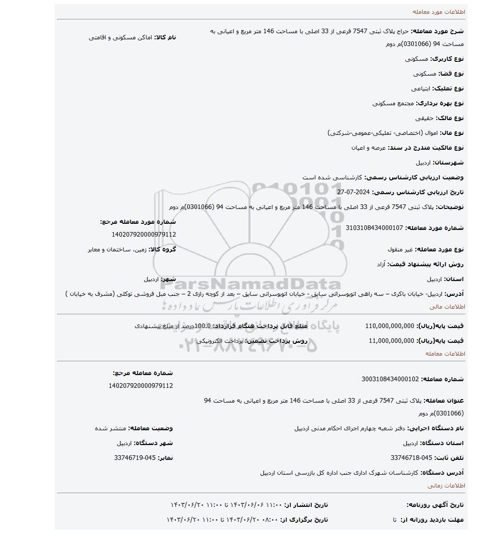 شرح مورد معامله: حراج پلاک ثبتی 7547 فرعی از 33 اصلی با مساحت 146 متر مربع و اعیانی به مساحت 94 (0301066)م دومنام کالا: اماکن مسکونی و اقامتی