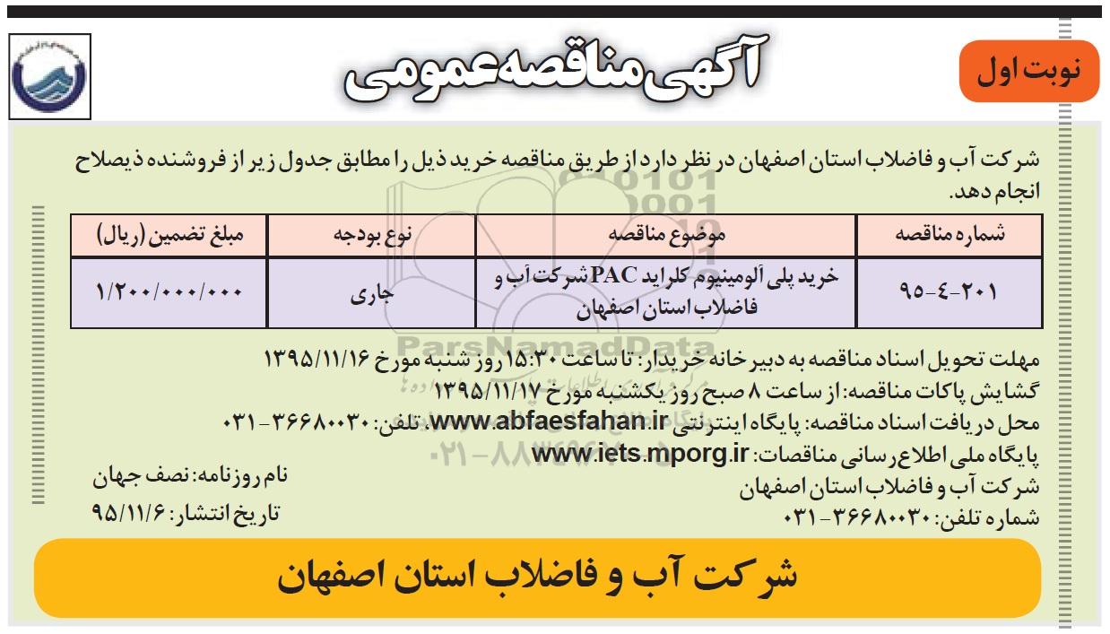 95-4-201 خرید پلی آلومینیوم کلراید PAC شرکت آب و فاضلاب استان اصفهان