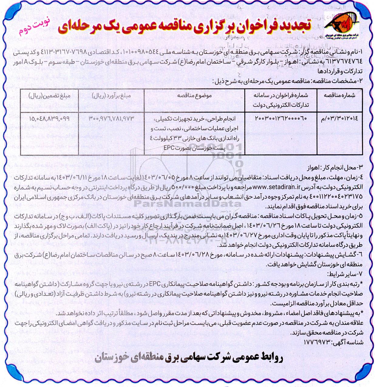 تجدید مناقصه انجام طراحی، خرید تجهیزات تکمیلی، اجرای عملیات ساختمانی، نصب، تست و راه اندازی بانک های خازنی- نوبت دوم , تجدید مناقصه انجام طراحی، خرید تجهیزات تکمیلی، اجرای عملیات ساختمانی، نصب، تست و راه اندازی بانک های خازنی- نوبت دوم